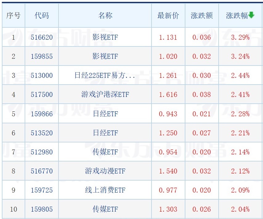 ETF方面,2只影视ETF大涨超3%,传媒、游戏动漫等ETF涨超2%。此外,受日本股市大涨影响,日经ETF涨超2%。