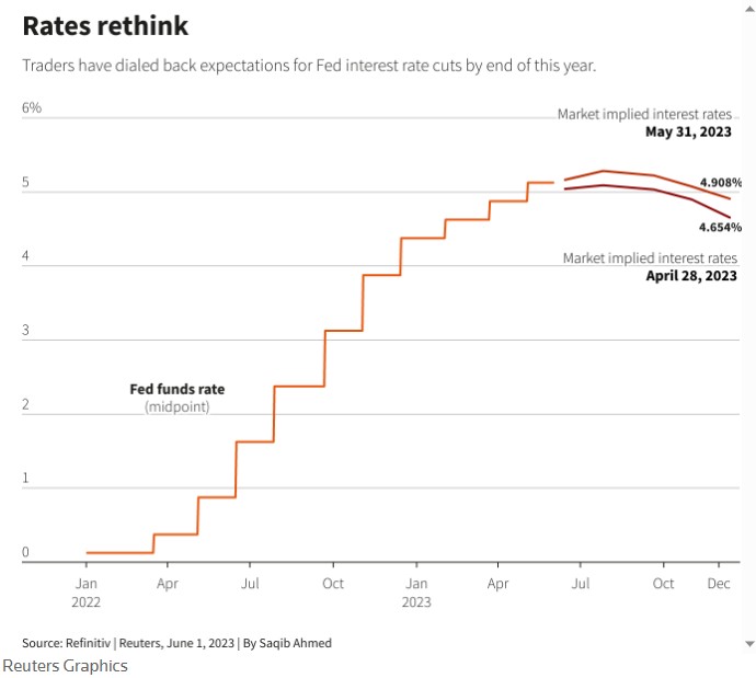 不过,一系列强劲的美国经济数据令这些空头们受挫。尽管美联储为放缓经济增长和遏制通胀而连番加息,但美国经济仍具有韧性。上周五公布的数据显示,美国5月非农就业新增33.9万人,为2023年1月以来最大增幅,远高于市场预期的19万人。而此前公布的消费者支出、新屋销售等其他数据也不支持美联储将在近期降息的观点。