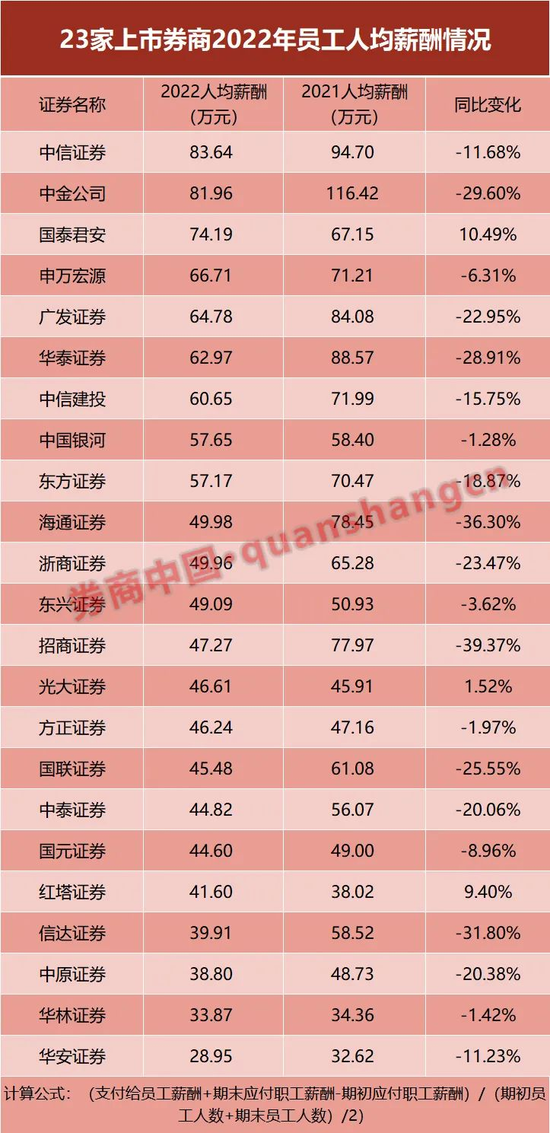 ¡¡¡¡Èô°´ÕÕ¡°Ô±¹¤È˾ùн³ê=£¨Ö§¸¶¸øÔ±¹¤Ð½³ê+ÆÚĩӦ¸¶Ö°¹¤Ð½³ê-ÆÚ³õÓ¦¸¶Ö°¹¤Ð½³ê£©/£¨£¨ÆÚ³õÔ±¹¤ÈËÊý+ÆÚĩԱ¹¤ÈËÊý£©/2£©¡±µÄ¿Ú¾¶¼ÆË㣬2022ÄêÈ˾ùн³ê½Ï¸ßµÄÊÇÖÐÐÅ֤ȯ(20.000, -0.19, -0.94%)¡¢Öнð¹«Ë¾(40.210, -0.54, -1.33%)£¬È˾ùн³ê·Ö±ðΪ83.64ÍòÔª¡¢81.96ÍòÔª£¬·Ö±ðÏà±È2021ÄêϽµ11.68%¡¢29.60%£¬ÆäÖÐÖнð¹«Ë¾È˾ùËõË®Óâ30ÍòÔª¡£