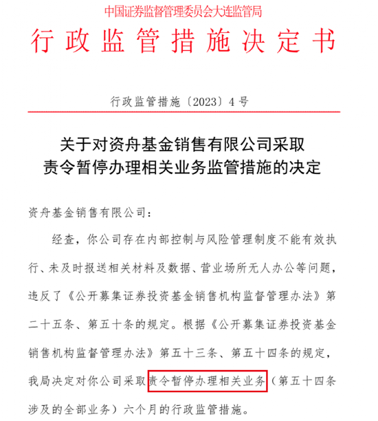 基于此,大连证监局对资舟基金销售采取责令暂停办理相关业务六个月的行政监管措施。