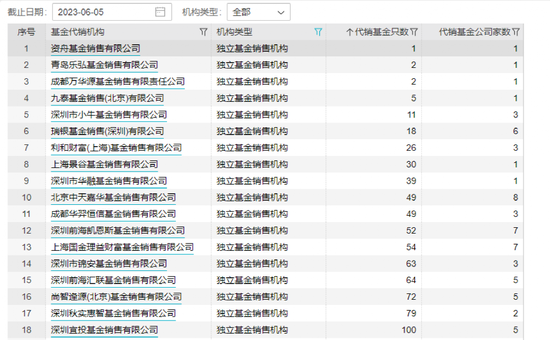 Wind数据显示,除资舟基金销售外,目前尚有3家*基金销售机构代销基金数量不多于5只,16家代销数量在百只以下。