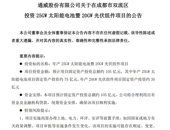 ¡¡¡¡6ÔÂ6ÈÕͨÍþ¹É·Ý¹«¸æÏÔʾ£¬È«×Ê×Ó¹«Ë¾Í¨ÍþÌ«ÑôÄܿƼ¼ÓÐÏÞ¹«Ë¾½«Ôڳɶ¼ÊÐË«Á÷ÇøÍ¶×ʽ¨ÉèÄê²ú25GWÌ«ÑôÄÜµç³Øôß20GW¹â·ü×é¼þÏîÄ¿£¬Í¶×Ê×ܶîÔ¼105ÒÚÔª¡£
