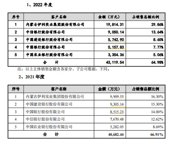 招股书显示,2020年-2022年,中奥通宇向前五大客户的销售金额分别为3.37亿元、4.07亿元、4.31亿元,占销售总额的比例分别为61.3%、66.91%、64.98%,对前五大客户较为依赖。