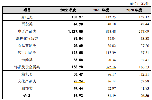 招股书显示,2021年,公司采购的11大类产品中,有一半处于价格上涨趋势,且涨幅较大。其中,电子产品类、饰品及贵金属类、床上用品类及服饰类产品采购单价分别为838.48元/件、372.16元/件、117.39元/件和52.97元/件,同比分别上涨285.17%、99.73%、20.39%和26.33%。