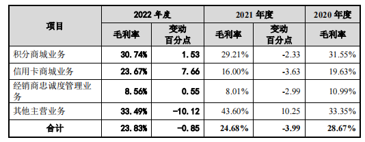 2021年,公司各项主营业务毛利率几乎全面掉线。当期,积分商城、信用卡商城、经销商忠诚度管理业务的毛利率分别为29.21%、16%和8.01%,同比分别下降2.33个百分点、3.63个百分点和2.99个百分点。仅有营收占比较低的其他主营业务毛利率同比上升了10.25个百分点,达到43.6%。
