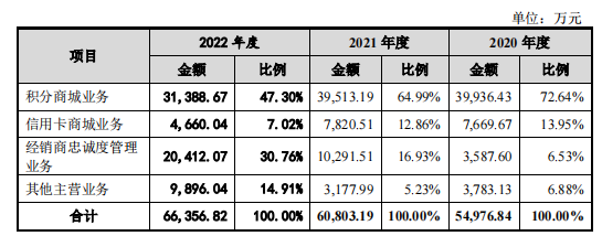 分具体业务构成来看,中奥通宇业绩波动较大。报告期内,其支柱性收入来源——积分商城业务的营收持续下降,各期分别为3.99亿元、3.95亿元、3.14亿元,2021年-2022年同比分别下降1.06%、20.56%,占总营收的比例从期初的72.64%大幅降至期末的47.3%。