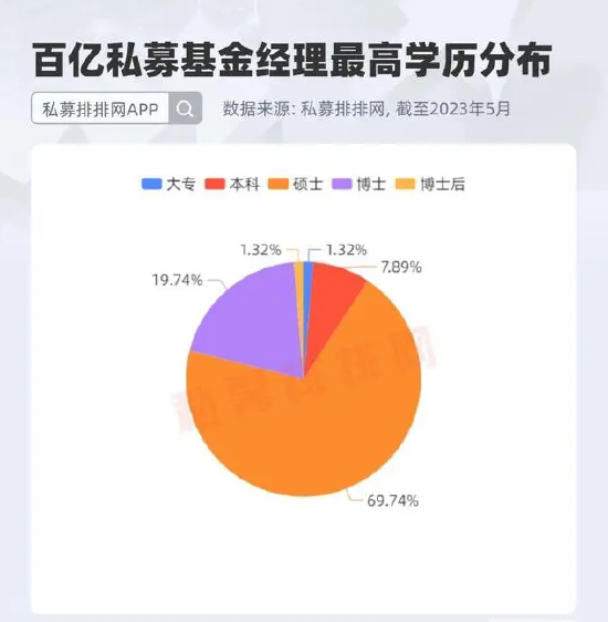 纵观位于头部的百亿私募基金经理,高学历和知名学府毕业是他们的基础标配。根据私募排排网不完全统计,在百亿私募基金经理中,硕士学历最多,占比达70%,博士学历次之,达20%,另外,本科学历占比达8%,博士后、大专学历各占1%。