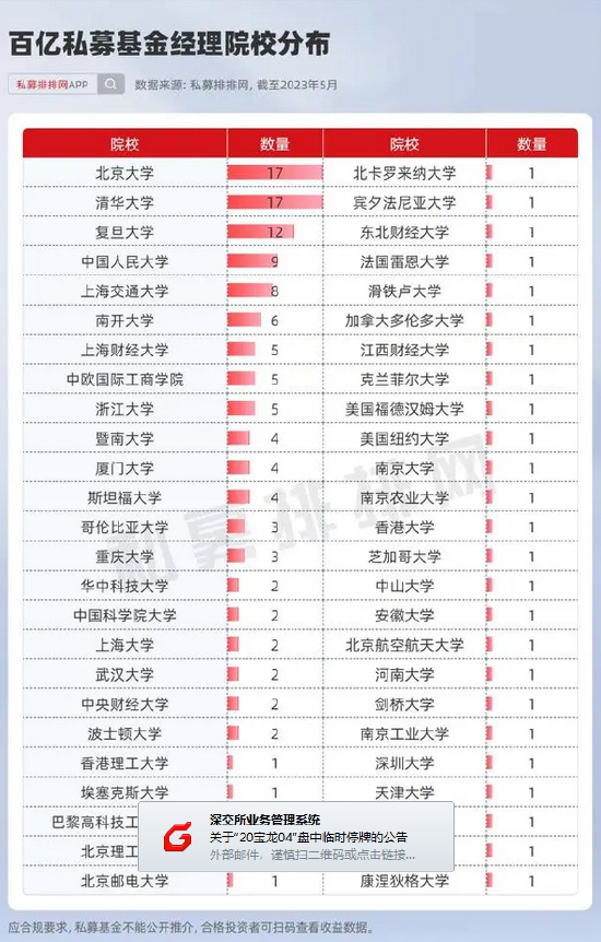 值得注意的是,明汯投资解环宇、九坤投资姚齐聪、思勰投资陈磐颖、珠海致诚卓远史帆等多位百亿量化私募基金经理均毕业于北京大学;清华大学阵容同样强大,因诺资产徐书楠、聚鸣投资刘晓龙、九坤投资王琛、千合资本王亚伟、高毅资产邓晓峰等都是清华校友。