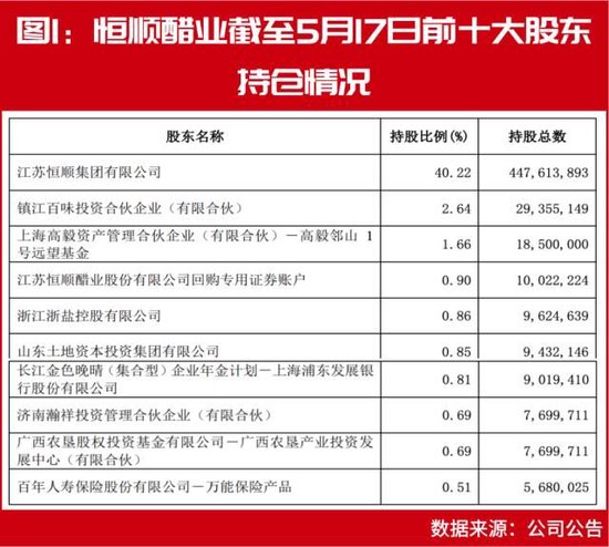 5月19日,恒顺醋业发布向特定对象发行股票结果暨股本变动公告,发行新增股份已于5月17日在中国证券登记结算有限责任公司上海分公司办理完毕登记托管手续。以当日的股东持仓情况统计,由冯柳掌舵的高毅邻山1号远望基金持股1850万股,与一季度末未发生变动,只是随着镇江百味投资合伙企业参与定增完成,持股排名由第二位降至了第三位(见图1)。如果目前冯柳仍未卖出,则其对恒顺醋业的持续重仓时间已接近6个报告期。