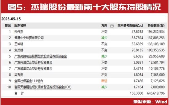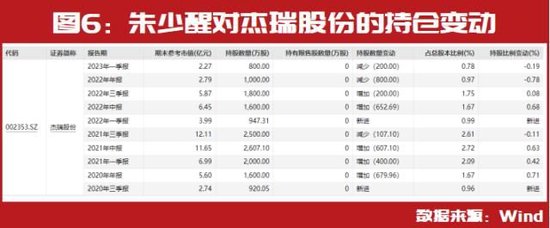 5月18日,杰瑞股份发布关于回购事项前十名股东和前十名无限售条件股东持股情况的公告,披露了截至5月15日大股东们的最新持股。朱少醒管理的富国天惠精选成长基金以700万股的持仓位居公司第十大股东,相较一季度末减少了100万股(见图5)。且自2022年四季度以来,这已是朱少醒对杰瑞股份实施的第三次减持行动。