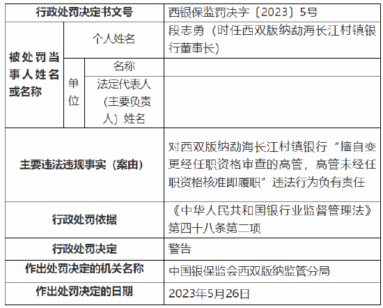 该行时任董事长段志勇对该银行“擅自变更经任职资格审查的高管,高管未经任职资格核准即履职”违法行为负有责任,被监管警告。