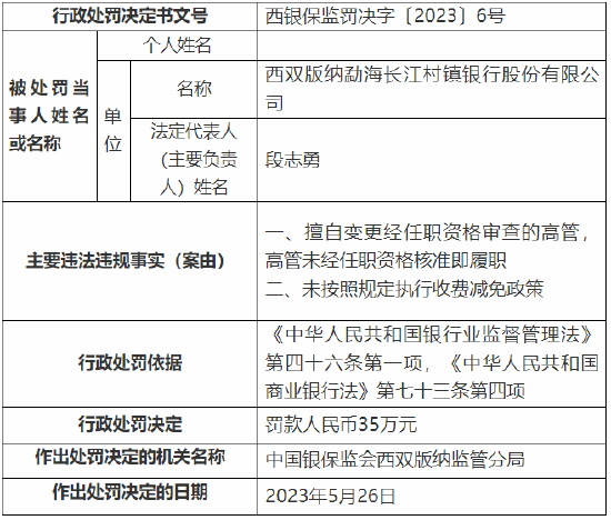 6月7日消息,据国家金融监督管理总局网站发布的行政处罚信息公开表显示,西双版纳勐腊长江村镇银行因员工行为管理不到位,违规使用信贷资金以及*支付与管理严重违反审慎经营规则,被监管罚款人民币60万元。
