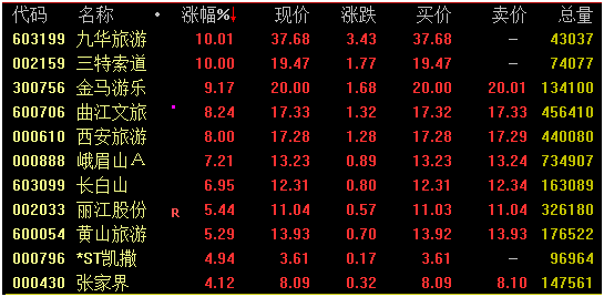 旅游餐饮板块今日大幅拉升,截至收盘,九华旅游、西安饮食、三特索道等涨停,金马游乐(20.000, 1.68, 9.17%)涨超9%,曲江文旅(17.330, 1.32, 8.24%)、西安旅游(17.280, 1.28, 8.00%)涨约8%,峨眉山A(13.230, 0.89, 7.21%)、长白山(12.310, 0.80, 6.95%)涨约7%,丽江股份(11.040, 0.57, 5.44%)、黄山旅游(13.930, 0.70, 5.29%)涨超5%。