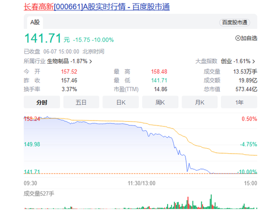 此外,长春高新(000661)今日午后快速跳水跌停,截至收盘,该股报141.71元,最新市值573亿元。