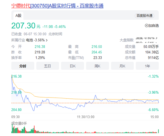 宁德时代(300750)今日再度大幅下挫,盘中一度跌近7%,收盘下跌5.46%报207.3元,最新市值9114亿元。