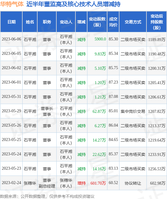 根据6月7日市场公开信息、上市公司公告及交易所披露数据整理,华特气体(83.160,-0.45, -0.54%)(688268)最新董监高及相关人员股份变动情况:2023年6月6日公司董事石平湘共减持公司股份5900.0股,占公司总股本为0.0049%。变动期间公司股价上涨0.13%,6月6日当日收盘报83.61元。
