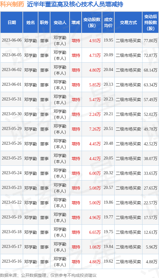 根据6月7日市场公开信息、上市公司公告及交易所披露数据整理,科兴制药(19.660, 0.01,0.05%)(688136)最新董监高及相关人员股份变动情况:2023年6月6日公司董事邓学勤共增持公司股份4.93万股,占公司总股本为0.0248%。变动期间公司股价下跌2.38%,6月6日当日收盘报19.65元。