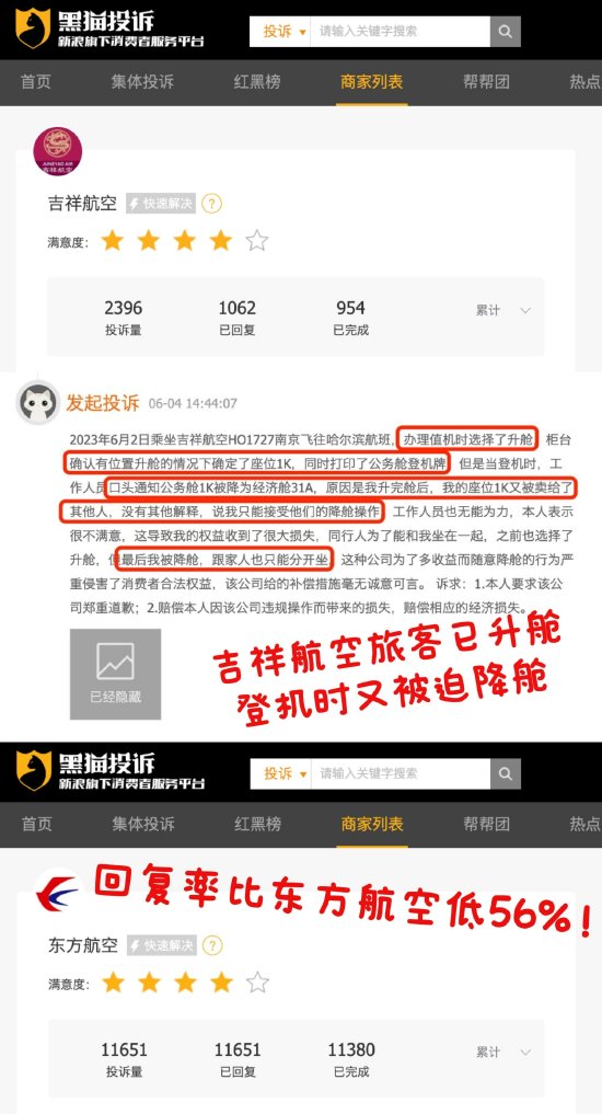 近期,有消费者通过黑猫投诉【投诉入口】平台反馈,自己购买吉祥航空(15.580, 0.22, 1.43%)机票后,在值机时选择了升舱,当时确认有位置升舱并打印了公务舱登机牌。然而旅客登机时又被口头通知降为经济舱,原因是升舱位置又被卖给了别人,航司没有其它解释,并表示只能接受降舱操作,导致旅客最终和家人分开坐。截至目前,吉祥航空在黑猫投诉平台投诉累计达2396单,回复率不足45%,比东方航空回复率低56%。