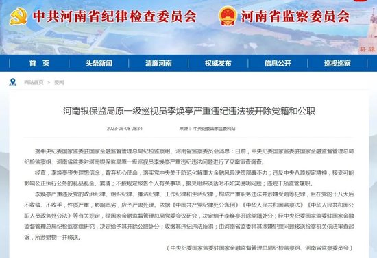 6月7日,河南银保监局原一级巡视员李焕亭严重违纪违法被开除党籍和公职