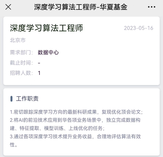 另一家头部基金公司——华夏基金也在招聘资深算法工程师,该工作需要将AI的前沿技术应用到华夏各项业务场景中,*完成数据构建、特征提取、模型训练、上线优化的任务;通过各项深度学习技术提升业务收益,合理地评估算法有效性。