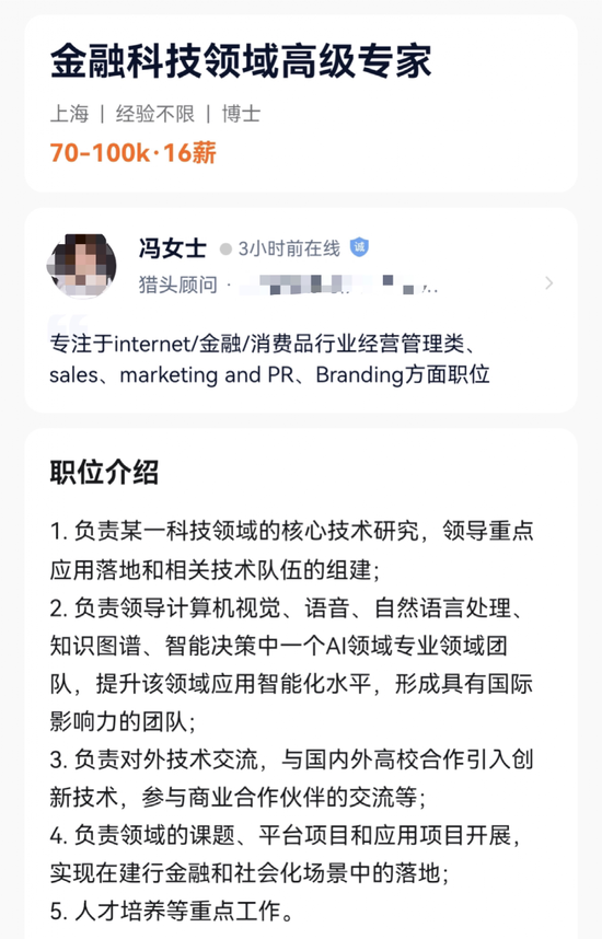 从目前各大招聘信息来看,人工智能方面的岗位薪资非常丰厚,例如某金融科技领域高级专家的岗位,猎头开出的月薪在7万-10万之间(总薪酬包含16薪)。