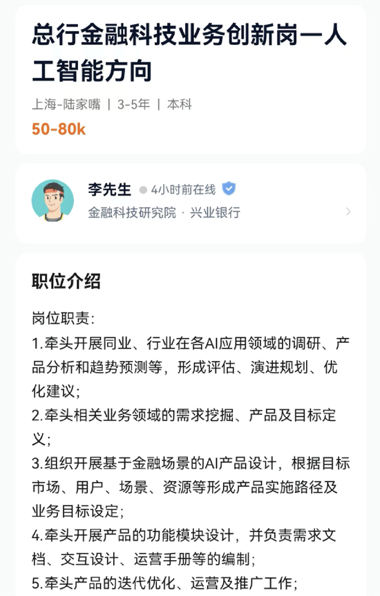 商业银行也在行动,例如,兴业银行总行正在招聘人工智能方向的金融科技业务创新岗,该岗位牵头开展同业、行业在各AI应用领域的调研、产品分析和趋势预测等,形成评估、演进规划、优化建议。