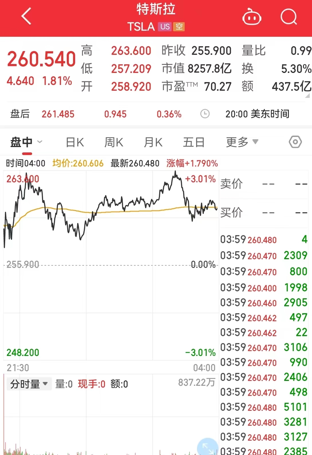 截至当地时间6月16日,特斯拉报260.54美元,涨幅1.81%,市值8257.8亿美元。