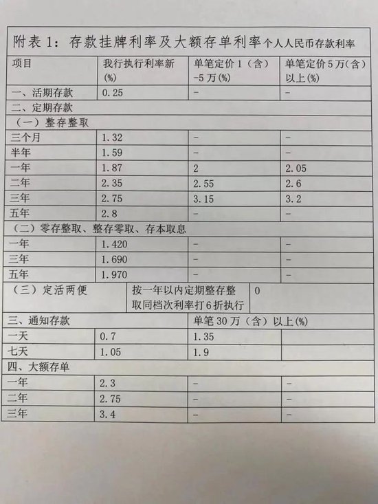 雅安雨城惠民村镇银行相关人士也向记者表示,该行下调了存款利率。目前整存整取定期存款挂牌利率1年期、2年期、3年期、5年期分别为2.15%、2.75%、3.4%、3.9%。扶绥深通村镇银行调整后的活期存款利率为0.2%,1年期、2年期、3年期、5年期整存整取定期存款挂牌利率分别为2.25%、2.85%、3.5%、4%。