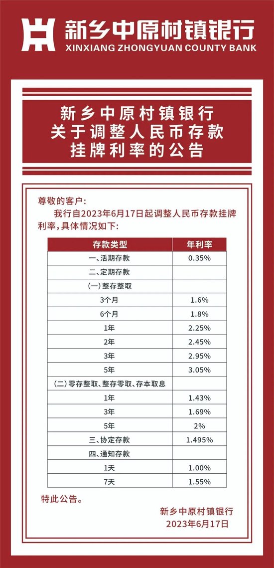 新乡中原村镇银行调整后的整存整取定期存款利率1年期、2年期、3年期、5年期分别为2.25%、2.45%、2.95%、3.05%,据该行网点一工作人员介绍,“我行1年期定期存款利率暂未进行调整,此次调整幅度较大的是2年期、3年期、5年期整存整取定期存款利率,在此之前分别为2.85%、3.3%、3.5%,目前储户存款以挂牌利率为准”。