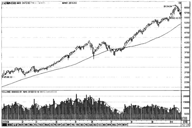多头市场的最大特征是换手积极。所谓换手率即指在一定时间内市场中股票转手买卖的频率,其数值越大,不仅说明交投的活跃,还表明交易者之间换手的充分程度。若股价下跌,成交量就适度萎缩,在上升趋势中的二次突破行情中,成交量若无法再扩大,股价就容易回跌,如此一段一段地上升,直到突破新高价,成交量也会创出新的纪录,直至成交量无法再扩大,原始上升行情宣告结束。如下图所示为中国股市的一段大牛市行情。