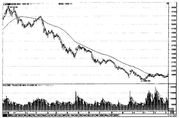如下图所示为中国股市2007年年末至2008年年底的大熊市行情,在此种行情中,投资者要格外谨慎,认真分析各种情形,作出正确的判断。