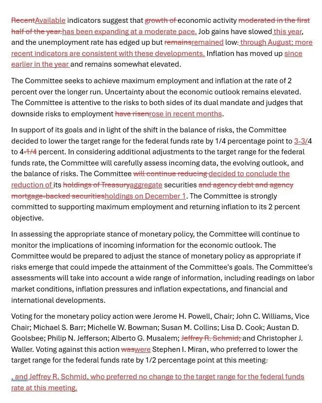 本次美联储决议相比上次的差异还体现在经济形势的表述上。相关调整主要反映了,美国联邦政府进入10月以来持续关门导致多种经济数据推迟发布的影响。