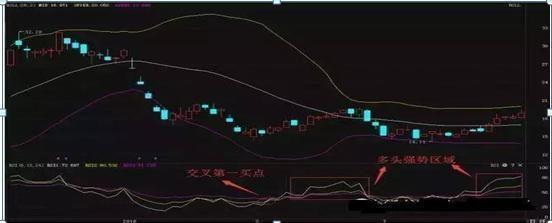 实际案例图解 2、RSI1(白色)和RSI2(黄色)低位金叉,买入信号 当RSI白线与黄线同时处于50以下的时候,突然一块上行,并且白线向上击穿黄金,这时就是超短线的一个强烈买入信号了,不过这也只是一种信号,我们在实际操作时应该结合成交量的变化来决定买卖。