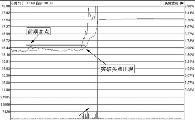 由于突破买点的参照可以提前确立出来,所以,投资者只需要在盘中耐心地等待突破走势的形成,一旦股价突破了盘中前期高点的价位就需要积极地进行买入操作。在上涨的过程中,股价再度形成了调整的走势,如图1-6所示画横线处。很快,股价便在成交量放大的推动下展开了突破的走势,只要股价不断地突破,买点也就会连续地出现。