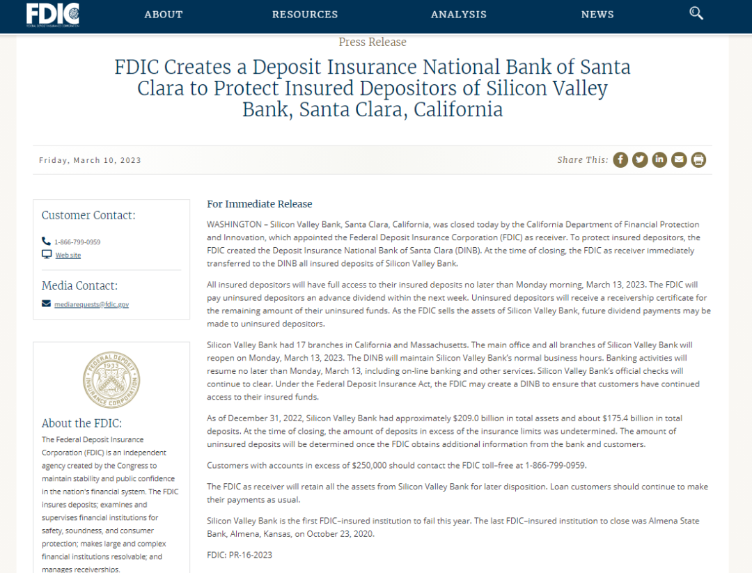 惊动白宫!硅谷银行破产,美财长紧急开会!“雷曼危机”再现?还有10家银行压力巨大…时间:2023-03-11         当地时间3月10日,美股三大指数收盘集体下挫。道指跌1.07%,标普500指数跌1.45%,纳斯达克(11138.8876, -199.47, -1.76%)指数跌1.76%。 受硅谷银行危机波及,金融板块再受重挫,区域性银行遭遇抛售,签字银行跌近23%,第一共和银行跌约15%。大型科技股多数下跌,英伟达跌超2%,苹果(148.5, -2.09, -1.39%)跌超1%。热门中概股涨跌不一,携程涨3%,京东(40.47, -1.21, -2.90%)跌2.9%。 美国劳工部发布的数据显示,美国2月非农就业人数增加31.1万人,超出市场预期。但失业率回升、薪资增幅放慢,令市场对美联储加息带来的忧虑减弱。 ![]() 美股道指四连跌,创去年6月以来最大周度跌幅 本周最后一个交易日,美股三大指数低开低走,虽然盘中一度转涨,但午后再度跳水。截至收盘,道指跌1.07%,报收31909.64点,录得连续四日收跌。纳指跌1.76%,收于11138.89点。标普500指数跌1.45%,报收3861.59点。 ![]() 受硅谷银行危机影响,投资者担忧发生金融危机以来最大的银行破产事件。本周,道指累跌4.44%,创2022年6月中旬以来最大单周跌幅;纳指累跌4.71%,录得2022年11月以来最大单周跌幅;标普500指数累跌4.55%,创2022年9月下旬以来最大单周跌幅。 美国劳工部发布的数据显示,美国2月非农就业人数增加31.1万人,道琼斯(31909.6406, -345.22, -1.07%)预计增幅为22.5万人,1月份前值下修1.3万人至50.4万人。其中,2月休闲和酒店、零售、政府、健康等行业岗位增幅明显,信息、交通仓储行业录得下滑。 当月失业率为3.6%,预期为3.4%,前值3.40%;失业人数升至590万人。2月份,美国雇员平均时薪增长8美分至33.09美元,环比增幅为0.2%,同比增长达4.6%,预期4.8%。分析人士指出,虽然就业增幅超出预期,但失业率意外回升、薪资增速低于预期,减弱此前市场对于美联储未来强劲货币政策预期。 美国总统拜登发表谈话时称,从去年1月至今,美国失业率连续14个月维持在4%以下。与去年夏天相比,通胀水平也已经下滑30%。通胀数据下周将出炉,他赞成美联储上次加息25个基点。“美联储会有更多讨论,我们拭目以待”。“在我就任时,美国失业率达6.3%,有1800万人失业。最新数据告诉我们,1200万人获得了工作。”拜登说。 ![]() 金融板块再受重挫,区域性银行暴跌 盘面上看,标普500指数十一大板块全线下跌。金融板块跌幅居前,区域性银行遭遇抛售。签字银行(Signature Bank)跌22.87%,领跌标普500指数成份股,第一共和银行跌14.84%。 全美六大银行盘初大幅下挫,但跌幅逐渐收窄,收盘涨跌不一。高盛(327.67, -14.42, -4.22%)跌4.22%;摩根士丹利(90.05, -2.15, -2.33%)跌2.33%;美国银行(30.27, -0.27, -0.88%)跌0.88%,盘初一度跌超5%;花旗集团跌0.53%;富国银行(41.36, 0.23, 0.56%)涨0.56%;摩根大通(133.65, 3.31, 2.54%)涨2.54%,盘初一度跌超1%。 大型科技股多数下跌。英伟达跌2.01%,苹果、微软(248.59, -3.73, -1.48%)、亚马逊(90.73, -1.52, -1.65%)、谷歌(91.01, -1.65, -1.78%)、脸书母公司Meta均跌超1%,特斯拉(173.44, 0.52, 0.30%)逆势上涨0.3%。特斯拉已开始为墨西哥蒙特雷附近的超级工厂招聘,招聘岗位包括管理顾问、建筑安全经理、财务分析师和物流专家等。 ![]() 国际油价回升,但能源板块未能实现反弹。西方石油(59.86, -0.70, -1.16%)、埃克森美孚(107.78, -1.35, -1.24%)、康菲石油(104.22, -1.59, -1.50%)跌超1%,雪佛龙(159.67, -0.84, -0.52%)、壳牌跌约0.5%。纽约商品交易所4月交货的轻质原油期货价格上涨0.96美元,收于每桶76.68美元,涨幅为1.27%;5月交货的伦敦布伦特原油期货价格上涨1.19美元,收于每桶82.78美元,涨幅为1.46%。 热门中概股涨跌不一,纳斯达克中国金龙指数跌0.3%。携程、中通(25.74, 0.76, 3.04%)快递涨约3%,拼多多(85.73, 0.08, 0.09%)微涨0.09%,阿里(82.96, -0.41, -0.49%)巴巴跌0.49%,京东跌2.9%。 ![]() “雷曼危机”重现?美国硅谷银行宣布破产 引爆此轮美股银行板块大震动的硅谷银行停牌,将被从标普500指数中剔除。 当地时间3月9日,硅谷银行(SVB)突然宣布,出售其所有210亿美元的可销售证券,因此遭受了18亿美元的亏损,并寻求通过出售普通股和优先股募资22.5亿美元,从而避免流动性危机。市场对这则消息的解读是,硅谷银行的流动性危机,远比预期的更严重。由此引发了美股银行板块的暴跌,3月9日,硅谷银行大跌超60%,创1998年以来最大跌幅。美国四大银行中,美国银行、富国银行均大跌超6%,摩根大通跌幅达5.4%,花旗集团跌4.1%。此外,费城银行指数暴跌7.7%,创2020年6月份以来最差单日表现。 当地时间3月10日盘前,硅谷银行盘前再度暴跌超60%,随后该股停牌。 硅谷银行是目前全美第16大银行,于1982年成立于美国加州圣何塞,1988年在纳斯达克挂牌上市,目前总部位于加利福尼亚州圣克拉拉。硅谷银行截至去年12月31日的总资产约为2090亿美元,存款总额约为1754亿美元(折合人民币约1.2万亿)。 硅谷银行面临的危机,令投资者担忧2008年华尔街知名投行雷曼破产的类似连锁反应重现。事实上,硅谷银行是本周美国第二家地区性银行陷入危机,此前Silvergate Capital Corp.宣布自愿清算银行业务。有媒体统计称,全美108家银行中有102家银行去年第四季度净息差扩大。剩下的10家银行在过去一年净息差收窄、或扩大幅度最小:硅谷银行排在第11位,去年第四季度净利息收入和平均总资产比值为1.93%,高于去年同期的1.83%。在硅谷银行爆雷后,排名前10的美国区域性银行最有可能面临