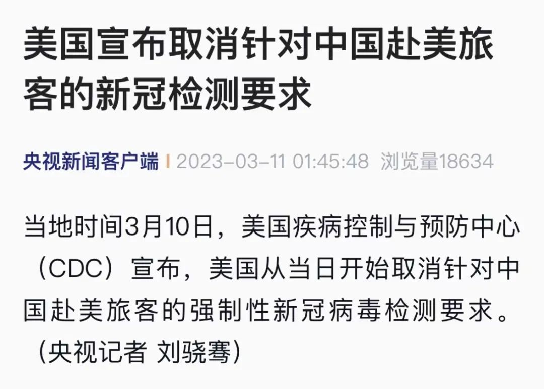 据央视消息,当地时间3月10日,美国疾病控制与预防中心(CDC)宣布,美国从当日开始取消针对中国赴美旅客的强制性新冠病毒检测要求。