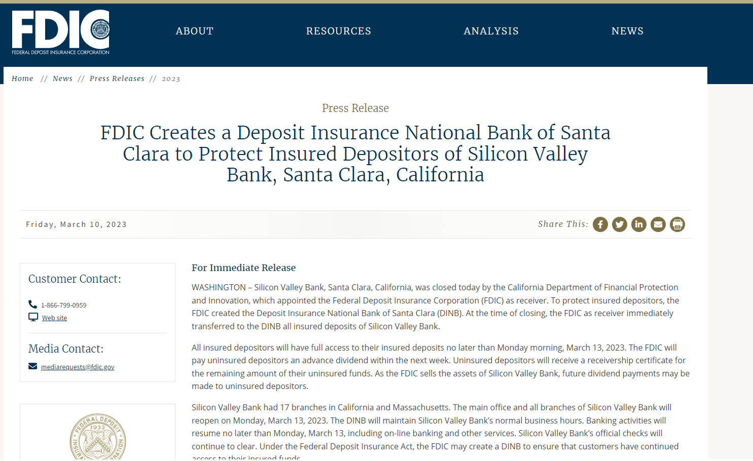 宣告倒闭!2000亿美元资产硅谷银行被接管!耶伦紧急开会,数十家公司回应,新“雷曼危机”来袭?时间:2023-03-11         据央视新闻3月11日消息,当地时间3月10日,根据美国联邦存款保险公司(FDIC)发布的一份声明,美国加州金融保护和创新部(DFPI)当日宣布关闭美国硅谷银行,并任命FDIC为破产管理人。 为保护投保的储户,美国联邦存款保险公司创建了存款保险国家银行(DINB),硅谷银行在关闭时,作为接管人的联邦存款保险公司需立即将硅谷银行所有受保存款转移到DINB。 受该消息影响,美股银行股领跌,Western Alliance银行跌超20%,第一共和银行跌逾14%,Silvergate跌超10%。 硅谷银行的爆雷,直接引发恐慌情绪蔓延,当前,市场更担忧的是,这会引发新一场“雷曼危机”吗? 纳斯达克(11138.8876, -199.47, -1.76%)暂停硅谷银行交易,FDIC宣布接管硅谷银行 当地时间3月9日,硅谷银行(SVB)突然宣布,出售其所有210亿美元的可销售证券,并寻求通过出售普通股和优先股募资22.5亿美元,以避免流动性危机。市场担忧的是,硅谷银行的流动性危机,或许远比预期的更严重。 硅谷银行当地时间周四重挫60%,该股周五盘前交易中再度下跌63%。据财联社,纳斯达克暂停硅谷银行金融集团的交易,该行将停牌至满足提供更多信息的要求。 ![]() 当地时间周五,加州金融保护与创新部门(DFPI)公告显示,FDIC在今天宣布,由于流动性不足和资不抵债,根据加州金融法典第592条,它已经接管了硅谷银行,并已控制了银行的存款。 ![]() DFPI指定联邦存款保险公司(FDIC)作为硅谷银行的接管方。硅谷银行为自2008年金融危机以来被FDIC接管的最大银行。 据悉,硅谷银行是一家州特许商业银行,也是位于圣克拉拉的联邦储备系统的成员,截至2022年12月31日,总资产约为2090亿美元,总存款约为1754亿美元。它的存款由联邦存款保险公司在适用的限额下提供联邦保险。 FDIC宣布,硅谷银行的官方支票将继续兑现,硅谷银行的总部和所有分支机构将于2023年3月13日(下周一)重新开放,受保险的储户到时可以获得存款。 FDIC的标准保险是为每家银行的每位储户提供最高25万美元的保险。目前尚不清楚关闭银行会对企业的大额账户或信贷额度产生何种影响。FDIC表示,将在下周内向没有保险的储户支付预付存款。 多家公司发布声明 在线金融服务公司派安赢(Payoneer):有不到2000万美元的资金存放在硅谷银行。 安霸(Ambarella)公司:共有约1700万美元存款存放在硅谷银行。 数字健康服务公司iRhythm Technologies:在硅谷银行设有的运营账户资金余额约5450万美元。公司在硅谷银行处有3500万美元的未偿还贷款。在硅谷银行以外渠道的资金仍在可预见未来足够公司使用。 制药公司Eyepoint Pharma:在硅谷银行存放有“数百万”美元的现金。与硅谷银行拥有最高额度4500万美元的信贷融资便利措施。 生物制药公司Karuna:在硅谷银行存放的现金或现金等价物规模非常有限。超出联邦存款保险公司25万美元赔付额度的资金不足100万美元。 制药公司Axsome Therapeutics:在硅谷银行和花旗银行都存放了“大量”的现金。 私营航空航天器制造商Rocket Labs:有7.9%的现金及现金等价物存放在硅谷银行,总计约3800万美元。 瞻博网络(30.8, -0.26, -0.84%)(JNPR):约有不到1%的现金及现金等价物存放在硅谷银行,影响有限。 在线个人金融公司SoFi:没有资产被存放在硅谷银行。与硅谷银行共同拥有的4000万美元融资便利工具因有联邦存款保险公司接管,未受损失。 生物制药公司Protagonist Therapeutics:截至3月9日约有1300万美元资金存放在硅谷银行。对硅谷银行的风险敞口仍处于“有限”水平。 太阳能新能源公司Sunnova:在硅谷银行的风险敞口小到可以忽略不计。 全球最大的住宅太阳能企业SunRun:在硅谷银行的存款总额不超过8000万美元。由于采用了对冲操作,公司在硅谷银行并没有太多的风险敞口。 加拿大加密货币公司Bigg Digital Assets:确认在SilverGate以及硅谷银行都没有风险敞口。 加密货币交易商双子信托(Gemini):当前没有与硅谷银行发生任何银行业务上的往来。名下所有产品和服务也与硅谷银行没有关联。 加密货币商业银行 Galaxy Digital创始人兼首席执行官 Mike Novogratz:未曾在银行业务上与硅谷银行有过往来。 币安:在硅谷银行没有风险敞口,所有客户资金当前均安全。  图片来源:视觉中国-美国财长耶伦召集多部门领导人开会 淡化硅谷银行危机的风险 财长耶伦正密切关注硅谷银行的情况。美国财政部长耶伦称,美国的银行系统“依旧坚韧”,监管机构“拥有有效的工具”来应对围绕硅谷银行的事态发展。美国财政部在一份通过电子邮件发表的声明中表示,耶伦周五召集美联储、联邦存款保险公司和货币监理署的领导人举行会议,讨论围绕硅谷银行的事态发展。经历了包括融资失败以及科技初创企业纷纷撤走资金等一系列事件的动荡一周之后,硅谷银行成为美国十多年来规模最大的倒闭银行。 新“雷曼危机”? 据券商中国,硅谷银行或将成为美国银行(30.27, -0.27, -0.88%)业危机的第一块“多米诺骨牌”,其他美国银行有可能不得不效仿硅谷银行,亏本抛售证券以应对流动性危机。 在疫情期间,大部分美国银行都将大量存款投资于美国国债等长期证券。据美国联邦存款保险公司的数据,由于利率上升,美国银行业在证券持有方面已经存在6200亿美元的未计价损失。 硅谷银行的危机让市场关注到其他银