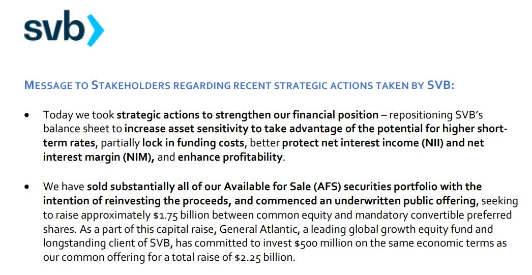 本周三,硅谷银行的母公司SVB Financial Group披露,银行出售了其所有210亿美元的可销售证券,出售的税后损失达到18亿美元,之后银行将出售普通股和优先股募集22.5亿美元。