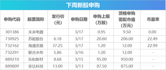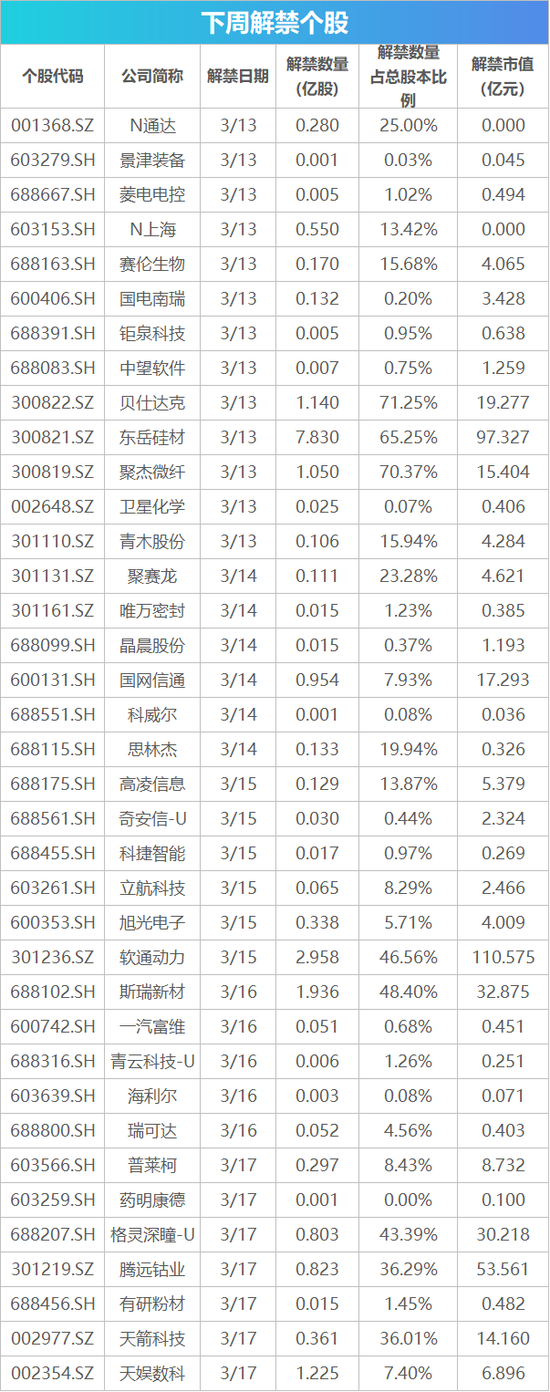 | 下周关注丨1-2月经济数据将公布时间:2023-03-12         【重磅新闻】 1-2月经济数据将公布 3月15日,国家统计局将公布1-2月经济数据。中金公司(40.080, -0.08, -0.20%)认为,1-2月是经济环比快速改善的阶段,未来修复斜率可能放缓,但继续复苏的方向不改变。 互联互通股票标的范围进一步扩大 3月3日,上交所、深交所、港交所同日宣布,自3月13日起,互联互通股票标的范围将进一步扩大。业内认为,标的范围扩大后,沪深股通将更广泛地纳入沪深两市上市股票,为境外投资者提供更多成长型、创新型资产配置选择,助力吸引境外资金入市;港股通纳入外国公司,将进一步支持香港提升对国际公司的吸引力。 百度围绕文心一言召开新闻发布会 百度官微称,百度计划于3月16日14时在北京总部召开新闻发布会,主题围绕文心一言。百度创始人、董事长兼首席执行官李彦宏,百度首席技术官王海峰将出席。 下周解禁市值超400亿元,软通动力(37.380, -0.63, -1.66%)解禁超110亿元 下周将有37只股解禁,按照最新收盘价计算,合计解禁市值478.91亿元。软通动力解禁市值规模最大,下周将有2.96亿股上市流通,主要为首发原股东限售股份和首发战略配售股份,解禁市值达110.57亿元。 14股解禁股数量占总股本比例超过10%,贝仕达克(16.910, 0.08, 0.48%)、聚杰微纤(14.670, -0.19, -1.28%)、东岳硅材(12.430, -0.17, -1.35%)的解禁比例较大,分别为71.25%、70.37%、65.25%。卫星化学(16.060, -0.48, -2.90%)、景津装备(30.700, -0.10, -0.32%)、药明康德(80.220, -0.53, -0.66%)的解禁比例较小。  【新股机会】 Wind数据统计显示,下周(3月13日至3月17日)将有6只新股发行,其中创业板有1只。3月13日发行的是在北交所上市的安达科技;3月15日发行的是在北交所上市的东和新材;3月16日发行的是联合水务;3月17日发行的是未来电器、海通发展、苏能股份;其中未来电器在创业板发行。 此外,下周有两只新股首发上市。上海建科将于3月13日在上交所上市,公司在绿色建筑、建筑节能、室内环境、既有建筑更新改造、固体废弃物综合利用等领域处于国内较高水平,承担了大量国家和上海市重点科研项目和重要标准的制定。通达创智将于3月13日在深交所上市,该公司是一家国家高新技术企业,主要从事体育户外、家居生活、健康护理等消费品的研发、生产和销售,主要产品包括体育用品、户外休闲用品、家用电动工具、室内家居用品、个人护理用品等。  |