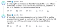 硅谷银行破产后,风暴继续蔓延。 3月11日消息,稳定币USDC(USD Coin)发行商Circle连发推特(Twitter)称,硅谷银行是Circle使用的六家银行合作伙伴之一,负责管理USDC约25%的现金储备,约400亿美元的USDC储备中有33亿美元仍留在硅谷银行。 资料来源:Twitter 此外,今日稳定币USDC价格一度跌至0.87美元附近。 USDC价格跌至0.87美元 当地时间3月10日,美国加州金融保护和创新部(DFPI)宣布关闭美国硅谷银行,并任命美国联邦存款保险公司(FDIC)为破产管理人。 受硅谷银行破产事件的影响,欧易OKX交易平台数据显示,截
